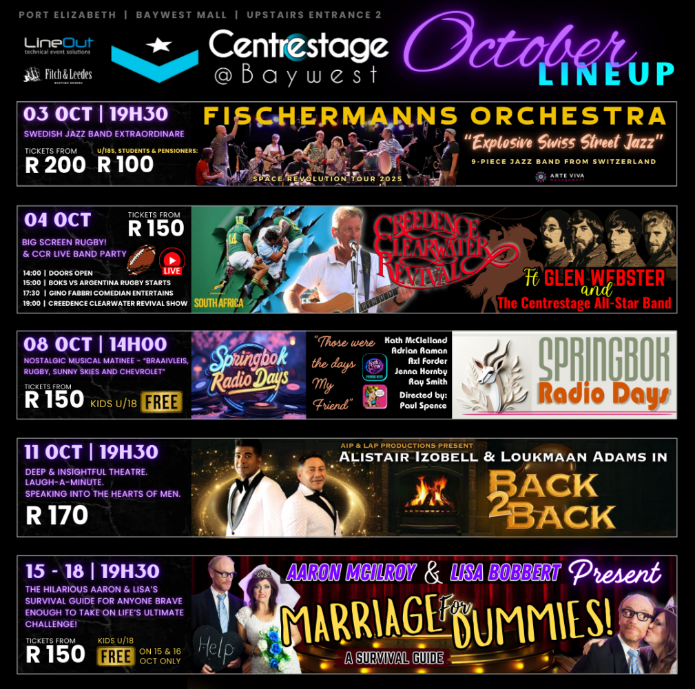 For more info on all upcoming shows, promotions and the latest news at Centrestage or events being hosted at Centrestage@Baywest, opt into our “CENTRESTAGE GROUPIES” WhatsApp group by clicking on the following link: